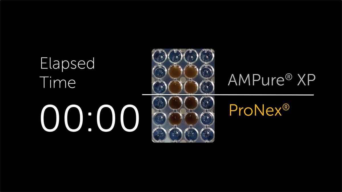 ProNex® beads (bottom) have a magnet response time that is ~5X faster than AMPure® XP beads (top), ensuring tighter bead pelleting and greater confidence in sample handling.